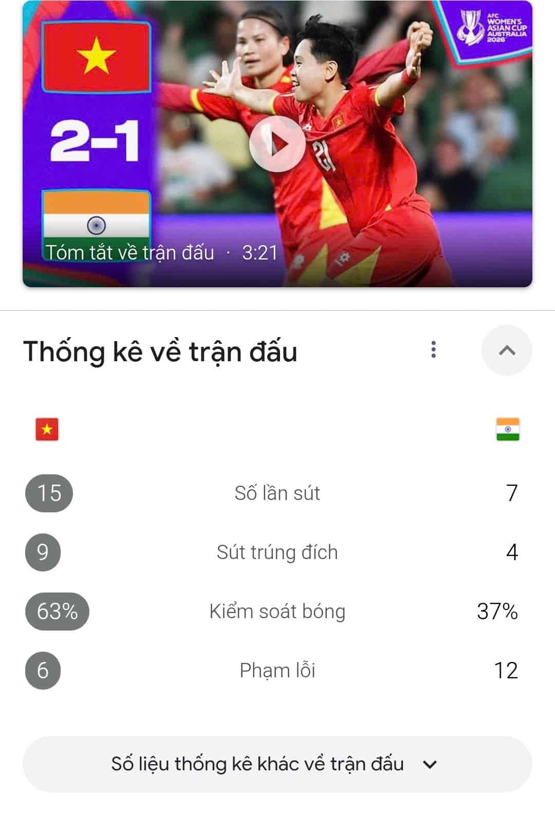 Với chiến thắng này, đội tuyển nữ Việt Nam có khởi đầu thuận lợi tại Bảng C, tạo đà tâm lý tích cực cho các lượt trận tiếp theo tại Giải Bóng Đá Nữ Châu Á 2026.