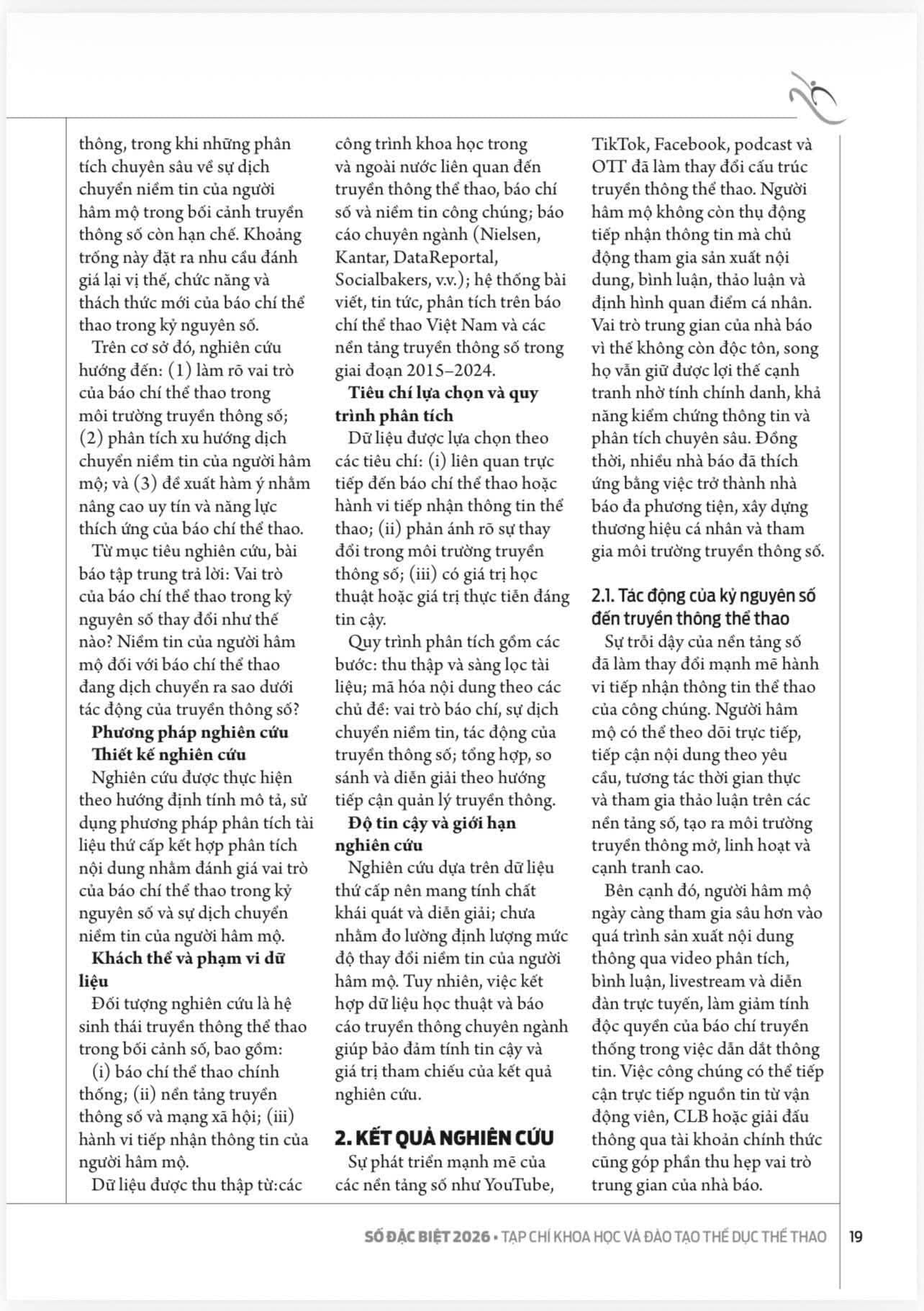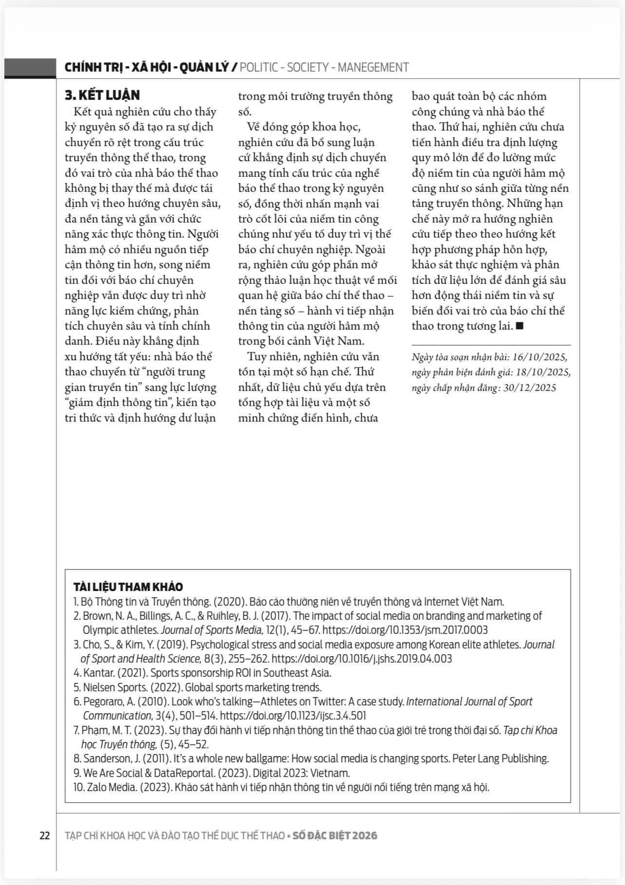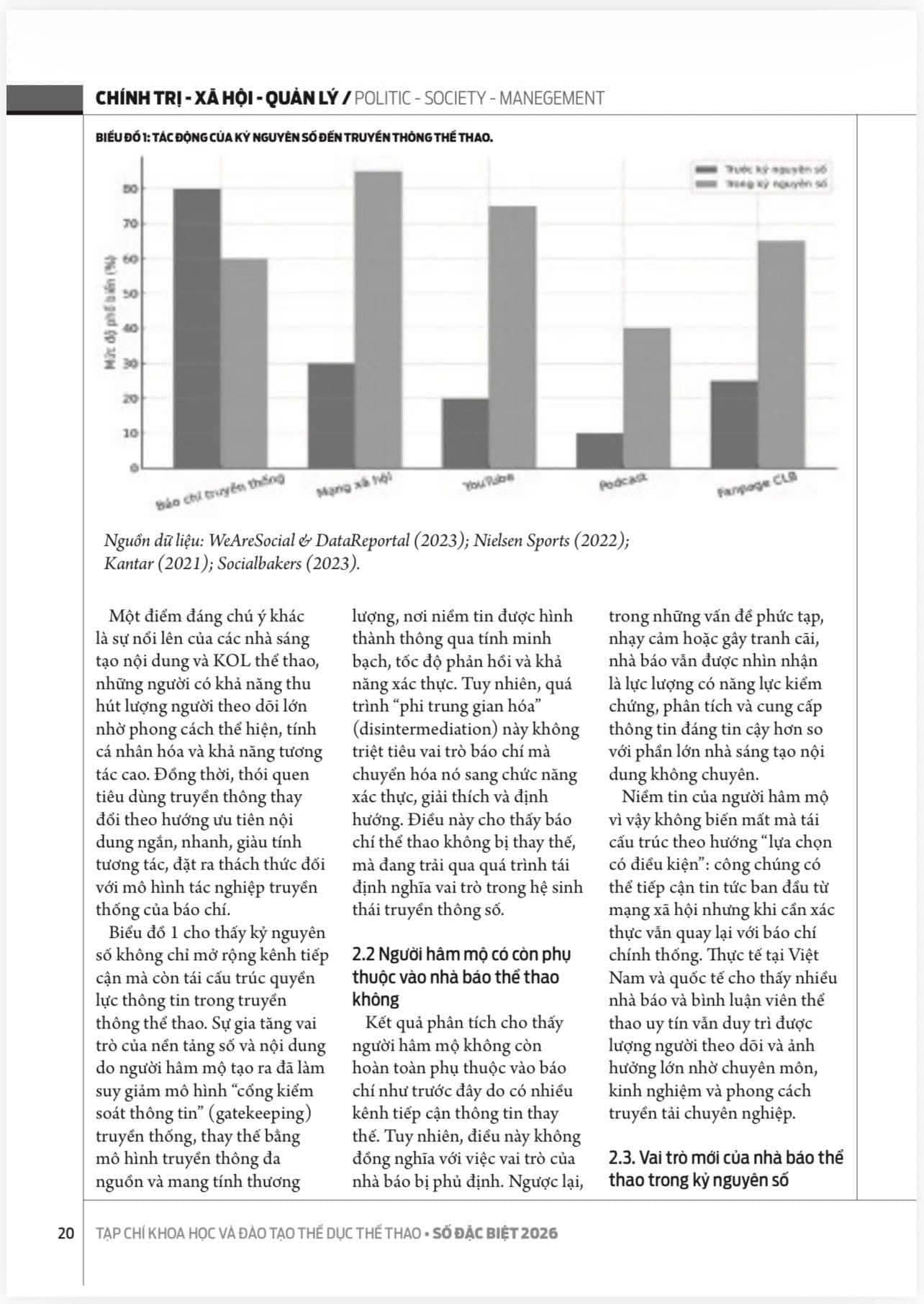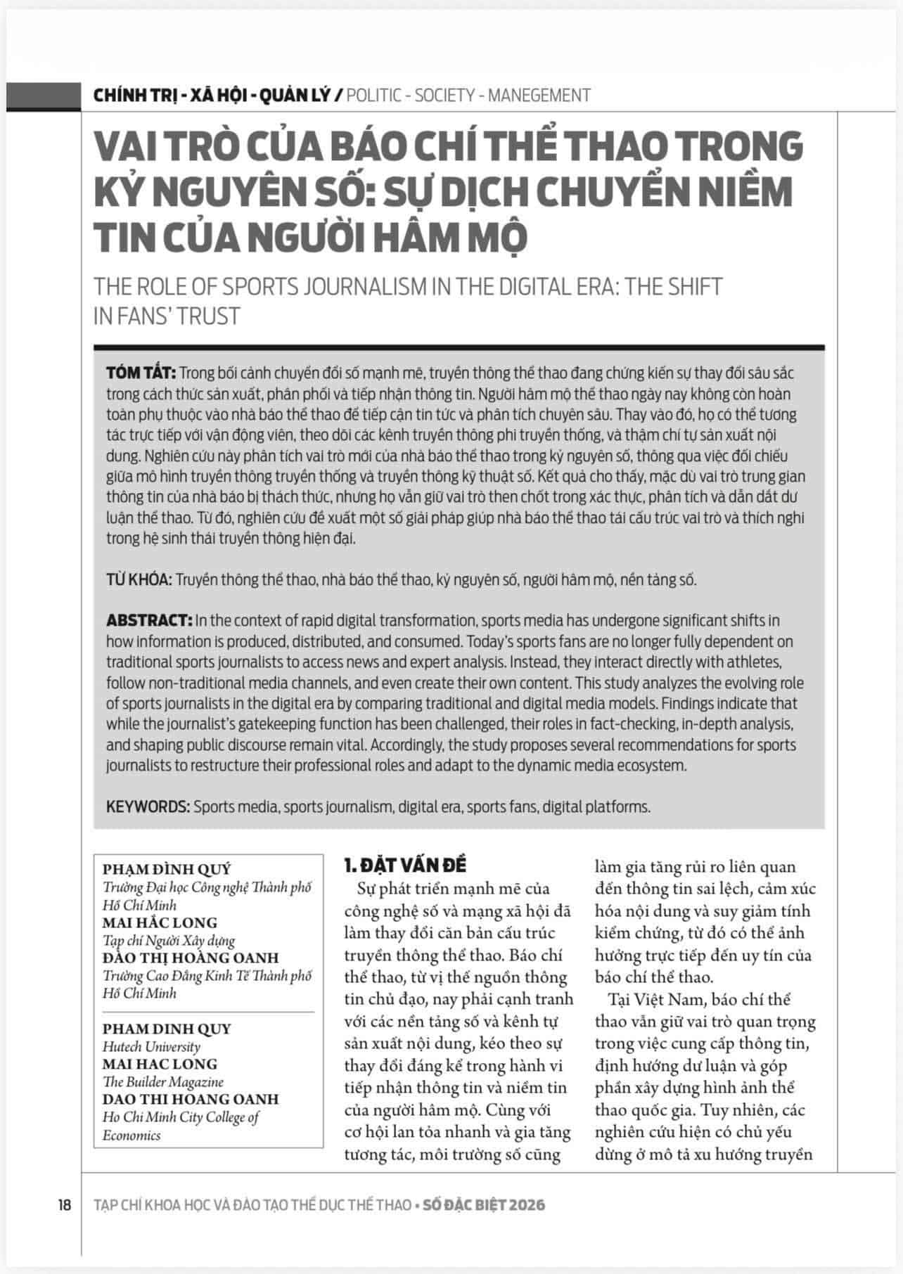 Trong bối cảnh chuyển đổi số đang tái cấu trúc sâu sắc hệ sinh thái truyền thông thể thao, bài báo “Vai trò của báo chí thể thao trong kỷ nguyên số: Sự dịch chuyển niềm tin của người hâm mộ” của nhóm tác giả: Phạm Đình Quý, Mai Hắc Long, Đào Thị Hoàng Oanh mang đến một góc nhìn khoa học, hệ thống và giàu tính thời sự về sự thay đổi trong hành vi tiếp nhận thông tin và niềm tin công chúng. Trên cơ sở phân tích so sánh giữa mô hình báo chí truyền thống và các nền tảng số, nhóm tác giả làm rõ sự chuyển dịch vai trò của nhà báo từ “người trung gian truyền tin” sang “lực lượng giám định thông tin”, giữ vai trò xác thực, phân tích chuyên sâu và định hướng dư luận trong môi trường truyền thông đa nguồn, đa nền tảng. Bài viết không chỉ góp phần bổ sung luận cứ học thuật về truyền thông thể thao trong kỷ nguyên số, mà còn gợi mở các khuyến nghị thực tiễn nhằm nâng cao năng lực thích ứng và vị thế nghề nghiệp của báo chí thể thao trong bối cảnh hiện đại.